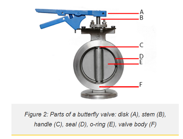 Principio de funcionamiento Las válvulas de mariposa tienen una construcción relativamente simple. La Figura 2 muestra los componentes principales de una válvula de mariposa, que son el cuerpo, el sello, el disco y el vástago. El disco (Figura 2 con la etiqueta E) de una válvula de mariposa se alinea con el centro de la tubería conectada y el vástago (Figura 2 con la etiqueta B) se conecta a un actuador o manija en el exterior de la válvula. En la posición cerrada, el disco es perpendicular al flujo, como se muestra en la Figura 2, y sella contra el asiento de la válvula (Figura 2 etiquetada como D). Una junta tórica (Figura 2 etiquetada C) en el empaque del vástago sella contra fugas a lo largo del vástago. Cuando el actuador o la manija gira el vástago de la válvula de mariposa 90°, el disco también gira 90° para quedar paralelo al flujo. La rotación parcial permite estrangular o proporcional el flujo.