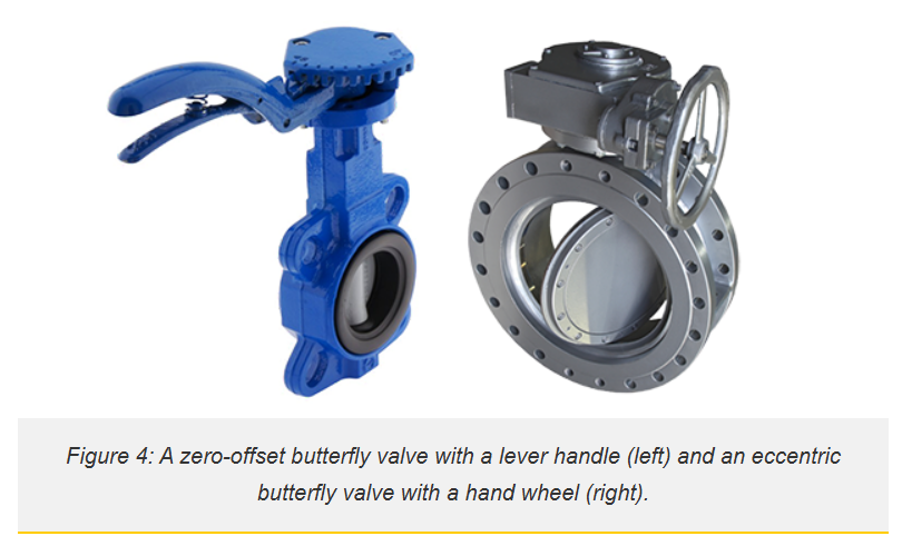 Tipos de válvulas de mariposa Las válvulas de mariposa vienen en diferentes diseños, cada una de las cuales sirve para aplicaciones y rangos de presión específicos. Las válvulas de mariposa se pueden clasificar según el diseño de cierre del disco, el diseño de la conexión y el método de actuación. Diseño del cierre del disco Las válvulas de mariposa pueden ser concéntricas o excéntricas según la ubicación del vástago en relación con la línea central del disco y el ángulo de la superficie del asiento de la válvula. Concéntrica El diseño más básico de una válvula de mariposa es una válvula de mariposa céntrica o concéntrica. El vástago pasa a través de la línea central del disco y el asiento es la periferia del diámetro interior del cuerpo de la válvula (Figura 4 a la izquierda). Este diseño de válvula sin compensación se conoce como asiento elástico porque el sellado eficiente depende de la flexibilidad del asiento de goma. Al cerrar, el disco primero entra en contacto con el asiento a unos 85° durante una rotación de 90°. Las válvulas de mariposa concéntricas son adecuadas para rangos de baja presión.